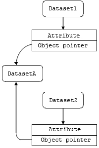 Note: In the figure above, DatasetA is an attribute of Dataset1 that is too large to store in Dataset1's header. DatasetA is associated with Dataset1 by means of an object reference pointer attached as an attribute to Dataset1. The attribute in DatasetA can be shared among multiple datasets by means of additional object reference pointers attached to additional datasets.