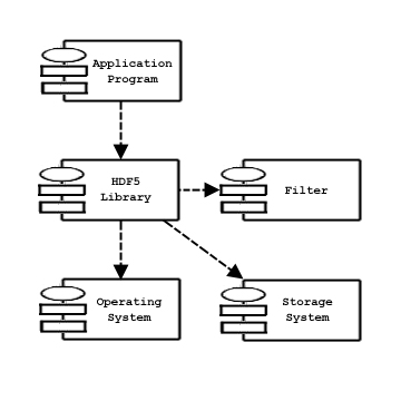 The HDF5 library is a C module that implements the programming model and abstract data model. The HDF5 library calls the operating system or other storage management software (for example, the MPI/IO Library) to store and retrieve persistent data. The HDF5 library may also link to other software such as filters for compression. The HDF5 library is linked to an application program which may be written in C, C++, Fortran, or Java. The application program implements problem specific algorithms and data structures and calls the HDF5 library to store and retrieve data. The figure below shows the dependencies of these modules.