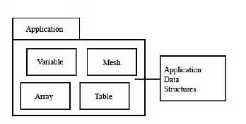 The Application Program uses data structures that represent the problem and algorithms including variables, tables, arrays, and meshes among other data structures. Depending on its design and function, an application may have quite a few different kinds of data structures and different numbers and sizes of objects.