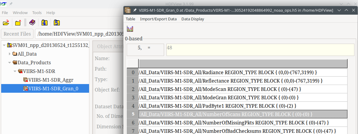As an example, examine the /All_Data/VIIRS-M1-SDR_All/Radiance dataset in the SVM01 file: