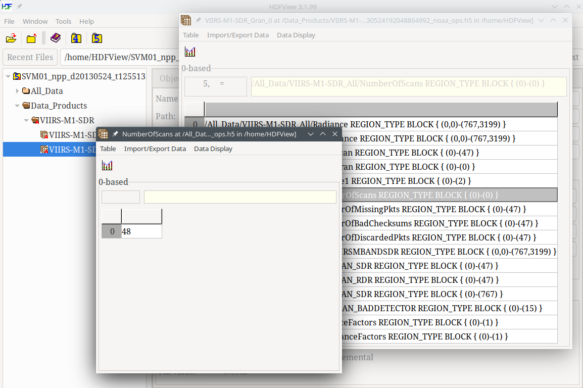 In the output above you can see that there are four granules (ending in Gran_#) in the /Data_Products/VIIRS-M9-SDR/ group.