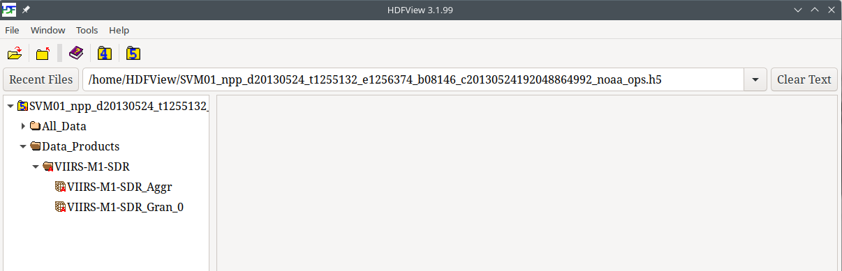 If you open the file in HDFView, it will display the file and the root level groups within it in the TreeView on the left. An HDF5 file is a folder with a "5" in the middle, followed by the file name. There are two folders (groups) within the JPSS file (All_Data/ and Data Products/), which you can select to see their contents: