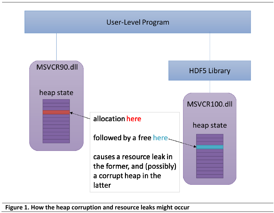 There are, however, several API calls in which the buffer is allocated by the HDF5 Library and returned to the user who is responsible for freeing it. This can be a problem when memory in the application and HDF5 Library are managed via different libraries as it can result in resource leaks or a corrupted heap. This heap corruption can result in subtle bugs that can be very difficult to reproduce and diagnose. In most cases, having the library allocate memory and the application free it is not a problem since memory operations will resolve down to the operating system's memory manager; however, there are cases where this is not true. For example, a debug memory manager may be in use by the application code but not the library. A complication that is unique to Windows is that the C standard library functions are implemented in VisualStudiospecific C run-time (CRT) libraries. When different versions of Visual Studio are used to compile the library and application code, the allocate and free calls are made in different libraries, which do not share state, leading to the previously mentioned resource and corruption issues.