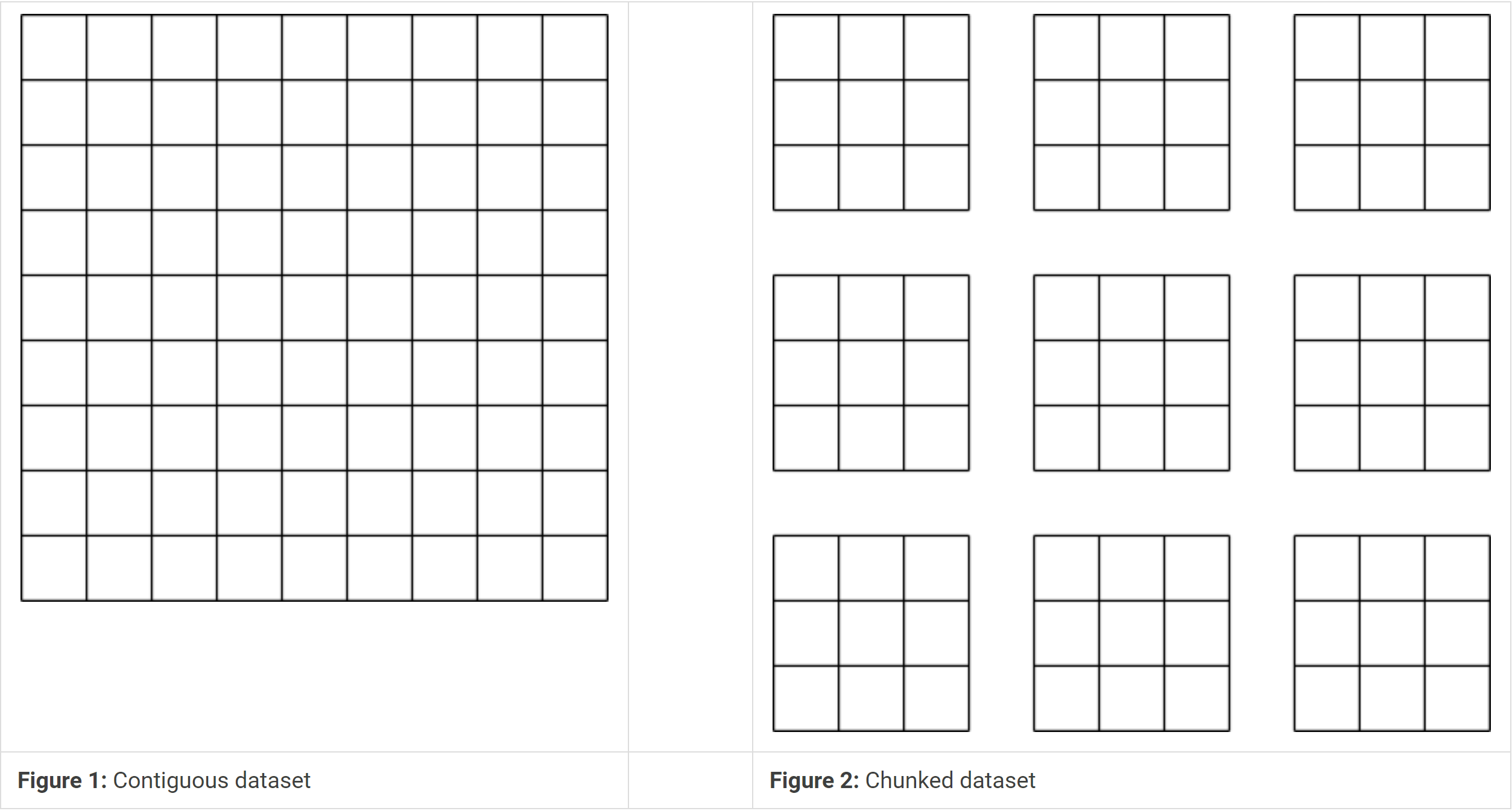 The chunks of a chunked dataset are split along logical boundaries in the dataset's representation as an array, not along boundaries in the serialized form. Suppose a dataset has a chunk size of 2x2. In this case, the first chunk would go from (0,0) to (2,2), the second from (0,2) to (2,4), and so on. By selecting the chunk size carefully, it is possible to fine tune I/O to maximize performance for any access pattern. Chunking is also required to use advanced features such as compression and dataset resizing.