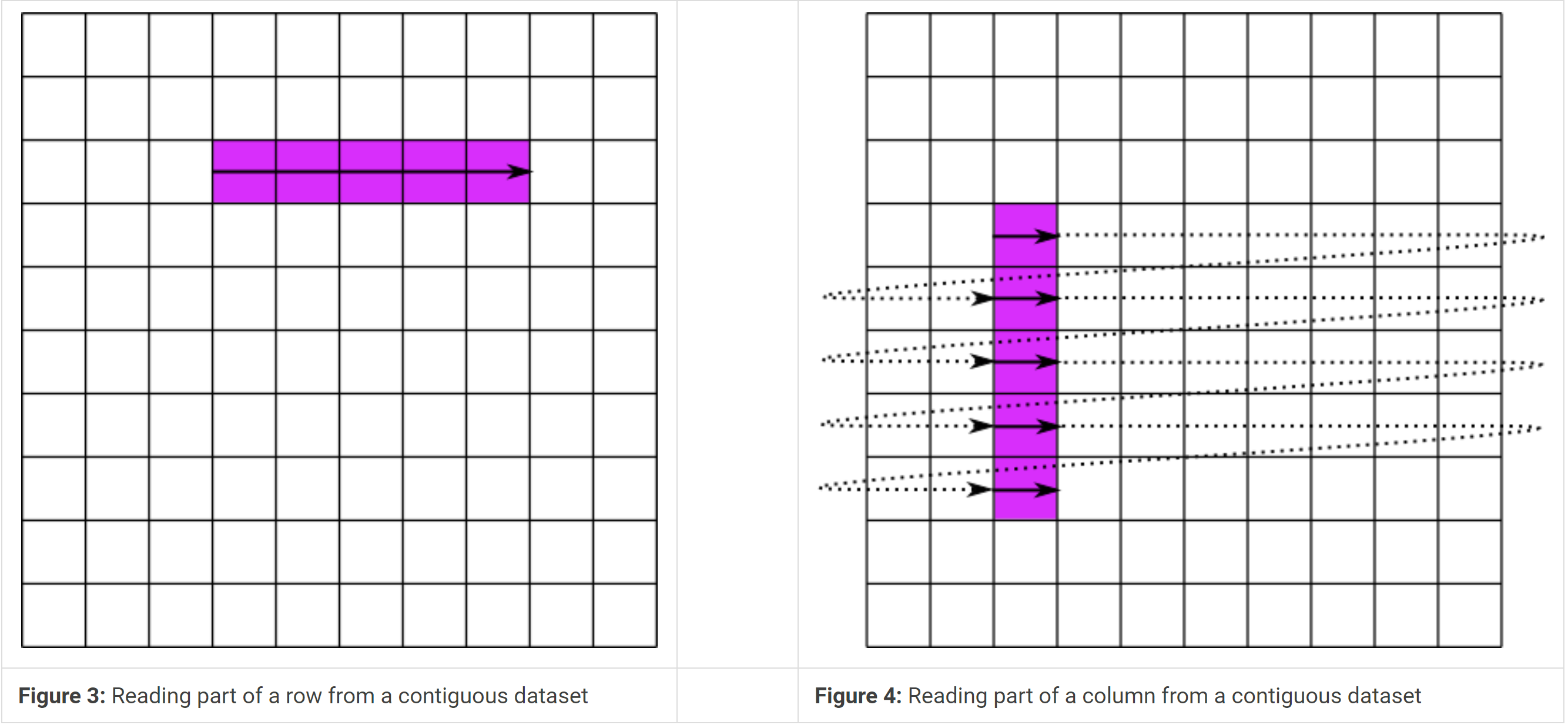The issues outlined above regarding data storage order help to illustrate one of the major benefits of dataset chunking, its ability to improve the performance of partial I/O. Partial I/O is an I/O operation (read or write) which operates on only one part of the dataset. To maximize the performance of partial I/O, the data elements selected for I/O must be contiguous on disk. As we saw above, with a contiguous dataset, this means that the selection must always equal the extent in all but the slowest changing dimension, unless the selection in the slowest changing dimension is a single element. With a 2-d dataset in C, this means that the selection must be as wide as the entire dataset unless only a single row is selected. With a 3-d dataset, this means that the selection must be as wide and as deep as the entire dataset, unless only a single row is selected, in which case it must still be as deep as the entire dataset, unless only a single column is also selected.