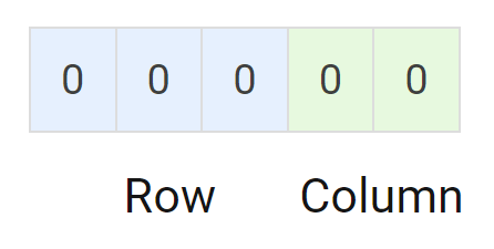 As of HDF5 1.10, the library uses a more complicated way to determine the chunk index. Each dimension gets a fixed number of bits for the number of chunks in that dimension. When creating the dataset, the library first determines the number of bits needed to encode the number of chunks in each dimension individually by using the log2 function. It then partitions the chunk index into bitfields, one for each dimension, where the size of each bitfield is as computed above. The fastest changing dimension is the least significant bit. To compute the chunk index for an individual chunk, for each dimension, the coordinates of that chunk in an array of chunks is placed into the corresponding bitfield. The 5 x 3 chunk example above needs 5 bits for its indices (as shown below, the 3 bits in blue are for the row, and the 2 bits in green are for the column)