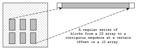 The more general case of a hyperslab can also be a regular pattern of points or blocks within the dataspace. Four parameters are required to describe a general hyperslab: the starting coordinates, the block size, the stride or space between blocks, and the number of blocks. These parameters are each expressed as a one-dimensional array with length equal to the rank of the dataspace and are described in the table below.