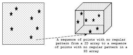 The next task is to define a dataspace in memory. Suppose that we have in memory a three-dimensional 7 x 7 x 3 array into which we wish to read the two-dimensional 3 x 4 hyperslab described above and that we want the memory selection to begin at the element <3,0,0> and reside in the plane of the first two dimensions of the array. Since the in-memory dataspace is three-dimensional, we have to describe the in-memory selection as three-dimensional. Since we are keeping the selection in the plane of the first two dimensions of the in-memory dataset, the in-memory selection will be a 3 x 4 x 1 array defined as <3,4,1>.