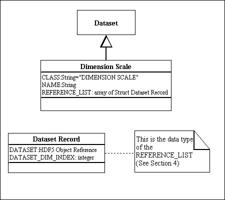 A Dataset may have zero or more Dimension Scales associated with its dataspace. When present, these associations are represented by two attributes of the Dataset. Table 4 defines these attributes.