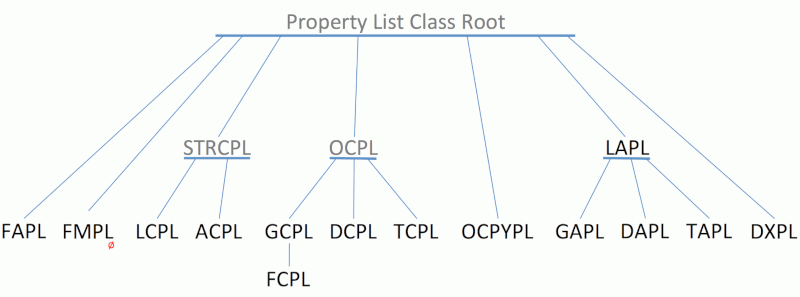 The “HDF5 property list class inheritance hierarchy” figure, immediately following, illustrates the inheritance hierarchy of HDF5's property list classes. Properties are defined at the root of the HDF5 property environment (Property List Class Root in the figure below). Property list classes then inherit properties from that root, either directly or indirectly through a parent class. In every case, a property list class inherits only the properties relevant to its role. For example, the Object Creation Properties (OCPL) inherits all properties that are relevant to the creation of any object while the Group Creation Properties (GCPL) inherits only those properties that are relevant to group creation.