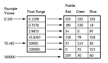 The range index array attribute defines the "<i>to</i>" of the range. Notice that the range index array attribute is one less entry in size than the palette. The first entry of 0.1259, specifies that all values below and up to 0.1259 inclusive, will map to the first palette entry. The second entry signifies that all values greater than 0.1259 up to 0.3278 inclusive, will map to the second palette entry, etc. All value greater than the last range index array attribute (100000) map to the last entry in the palette. |