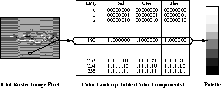 A palette is the means by which color is applied to an image and is also referred to as a color lookup table. It is a table in which every row contains the numerical representation of a particular color. In the example of an 8 bit standard RGB color model palette, this numerical representation of a color is presented as a triplet specifying the intensity of red, green, and blue components that make up each color.