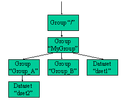Shown below is the contents and the definition of the group of groups.h5 (created by the C program). (The FORTRAN program creates the HDF5 file groupsf.h5 and the resulting DDL shows the filename groupsf.h5 in the first line.)