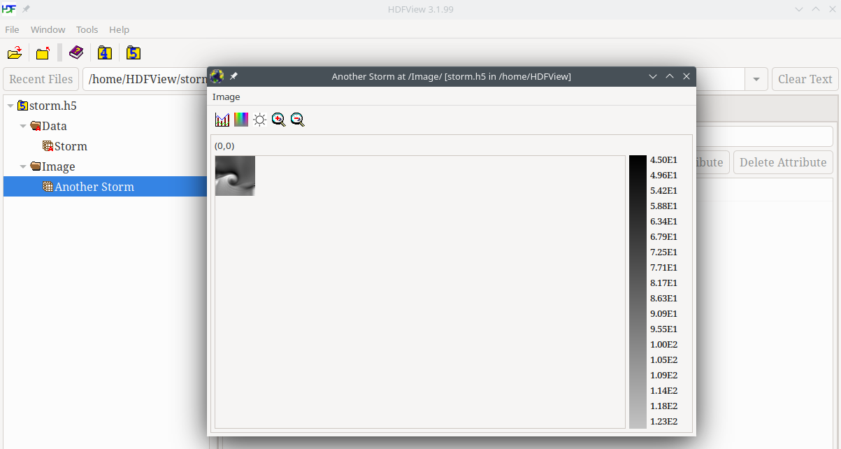 The steps below describe how to create a file (storm.h5), group (/Data), and a contiguous dataset (/Data/Storm) using HDFView. A group is an HDF5 object that allows objects to be collected together. A dataset is an array of data values. A contiguous dataset is one that is stored as a single block in the HDF5 file.