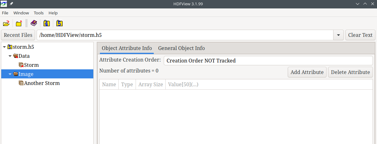 Click on the /Data folder in the tree view. You will see two tabs, Object Attribute Info and General Object Info, in the pane on the right site of the HDFView window.