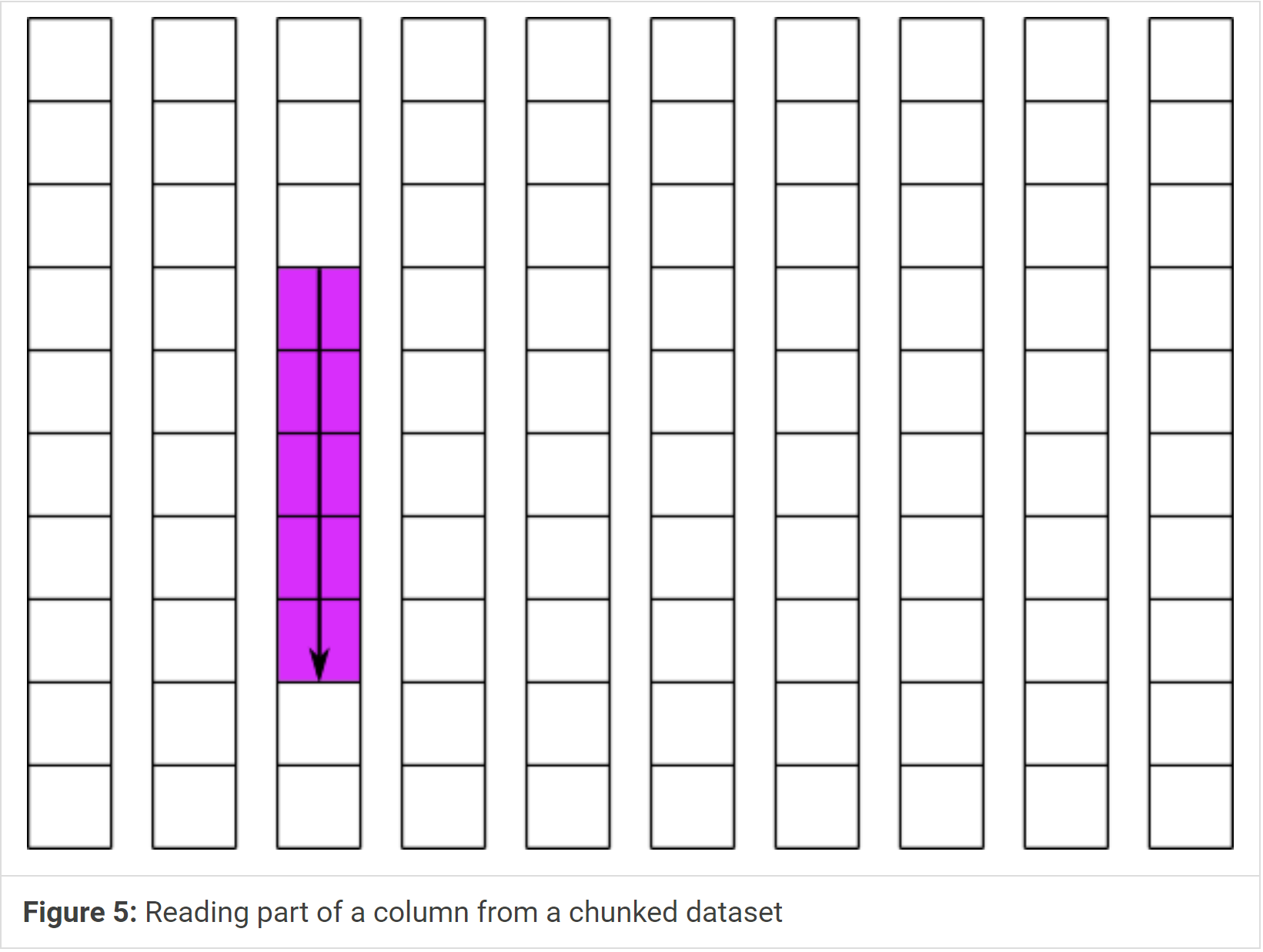 Using this strategy, we can greatly improve the performance of the operation shown in figure 4. If we create the dataset with a chunk size of 10x1, each column of the dataset will be stored separately and contiguously. The read of a partial column can then be done is a single operation. This is illustrated in figure 5, and the code to implement a similar operation is shown in example 2. For simplicity, example 2 implements writing to this dataset instead of reading from it.