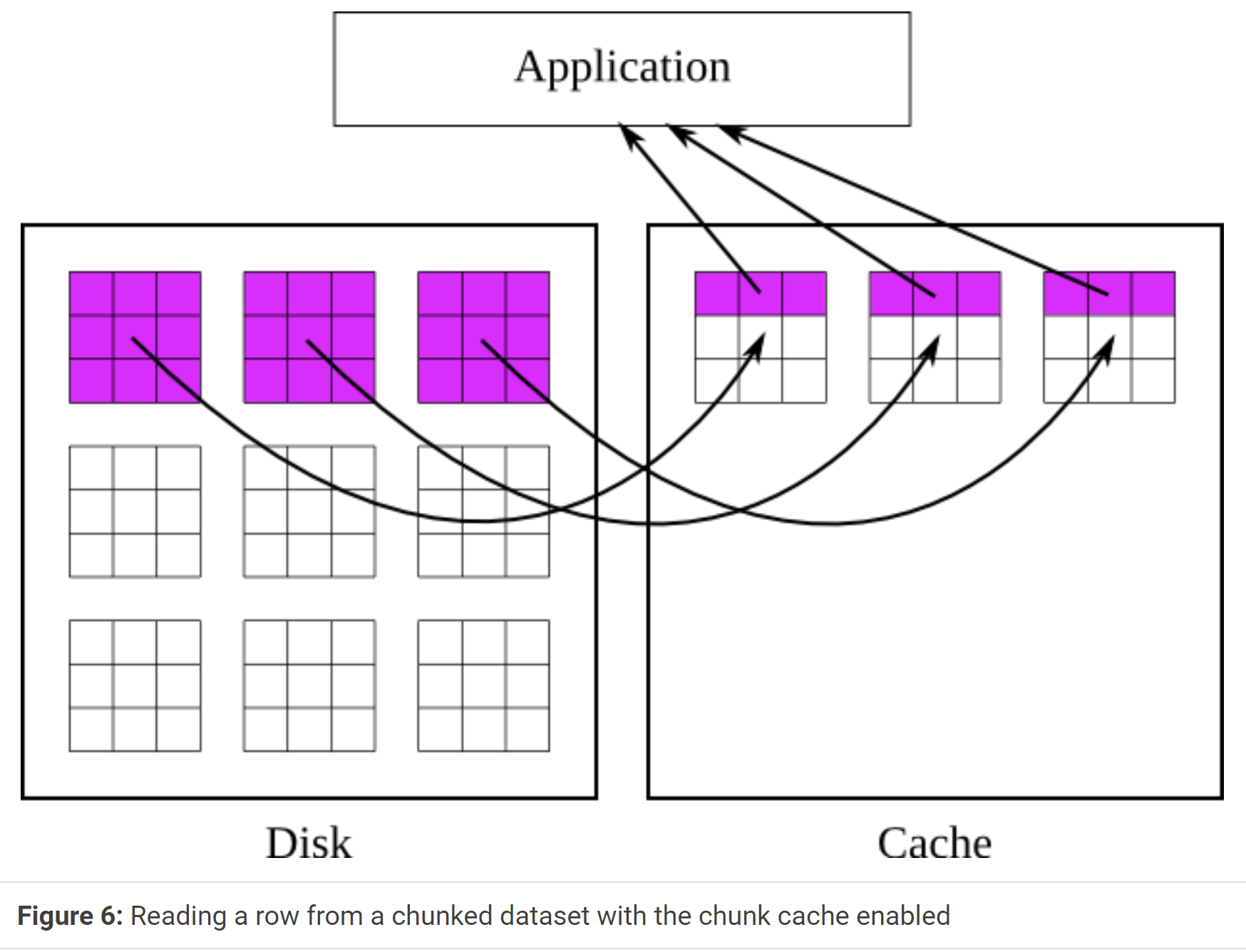 It is important to remember that chunk caching will only give a benefit when reading or writing the same chunk more than once. If, for example, an application is reading an entire dataset, with only whole chunks selected for each operation, then chunk caching will not help performance, and it may be preferable to completely disable the chunk cache in order to save memory. It may also be advantageous to disable the chunk cache when writing small amounts to many different chunks, if memory is not large enough to hold all those chunks in cache at once.