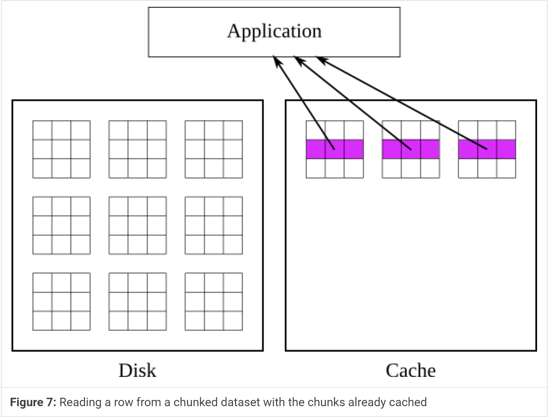 This process is illustrated in figures 6 and 7. In figure 6, the application requests a row of values, and the library responds by bringing the chunks containing that row into cache, and retrieving the values from cache. In figure 7, the application requests a different row that is covered by the same chunks, and the library retrieves the values directly from cache without touching the disk.